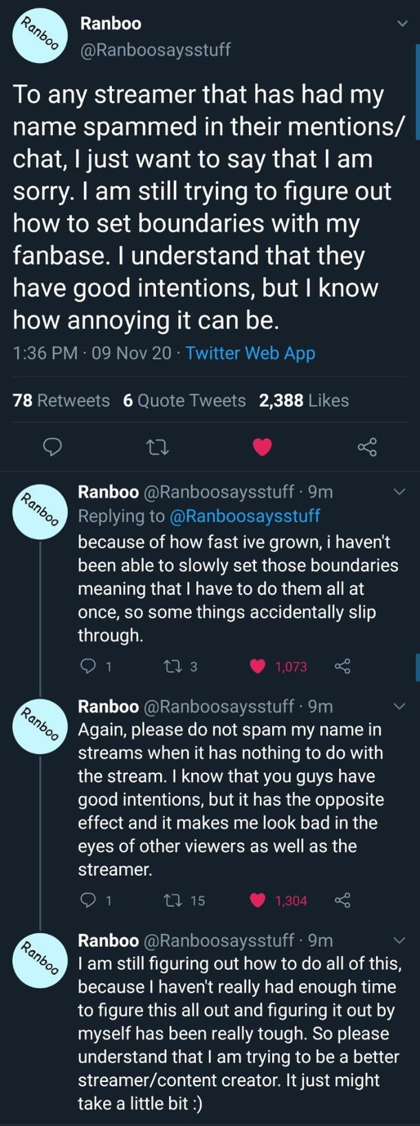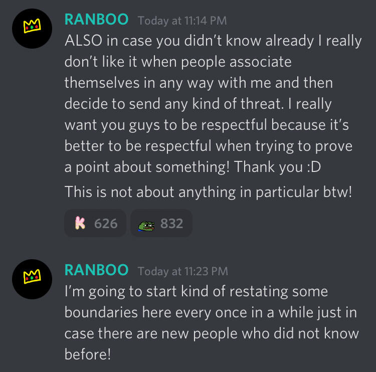 Clips/Twitter Spaces/Discord Stages: Ranboo is okay with people making a twitter space/record for those that miss any discord stages/spaces.