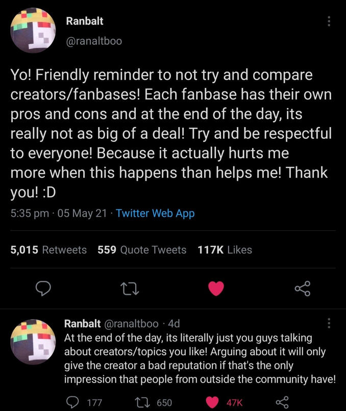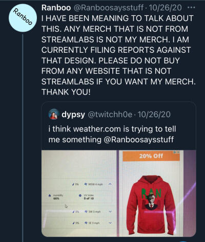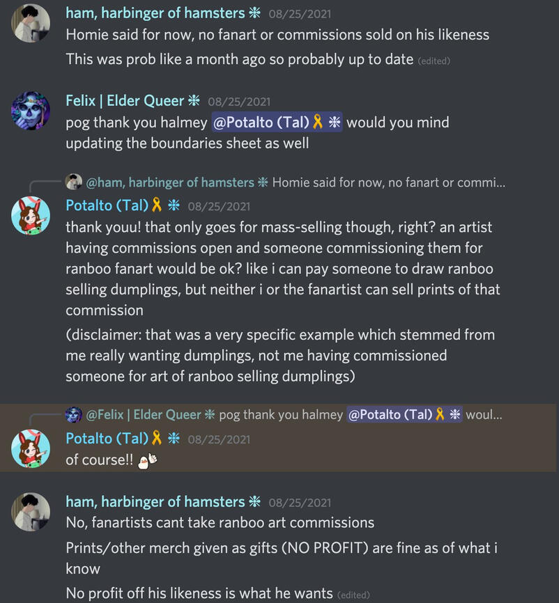 Fanmerch: Ranboo has responded to a tweet containing a picture of unofficial Ranboo merch that someone saw by encouraging people not to buy Ranboo merch from unofficial websites. This suggests that he is not okay with people selling their own fanmerch.
