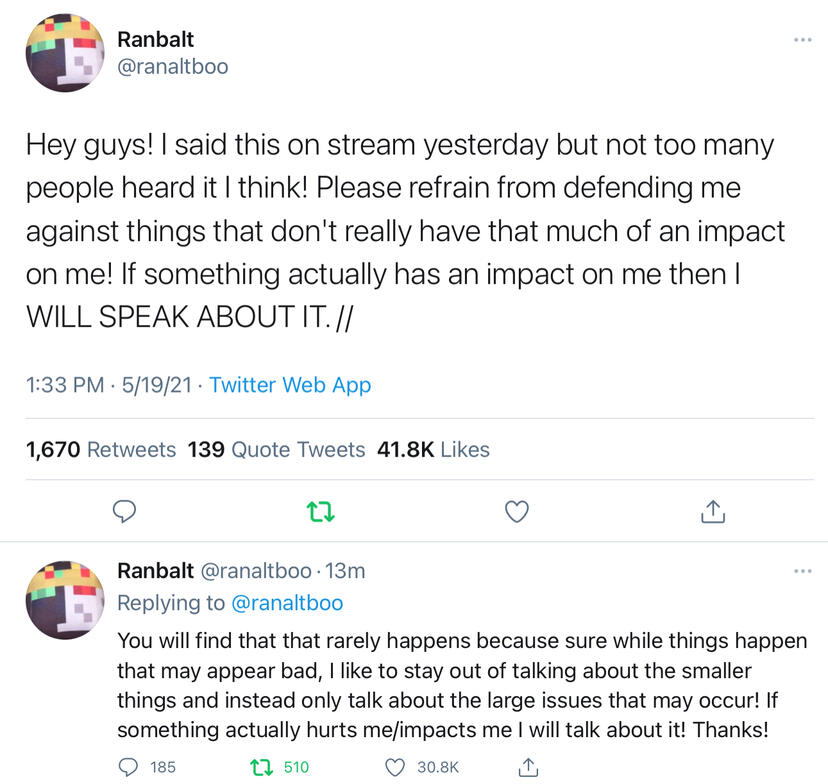 "Hot takes": he doesn't want people speaking for him (i.e. what you think he wants). This goes more on the idea of having to defend Ranboo and most likely the “Ranboo I’ll protect you” comments. If he thinks there's an issue with something, he'll address it.