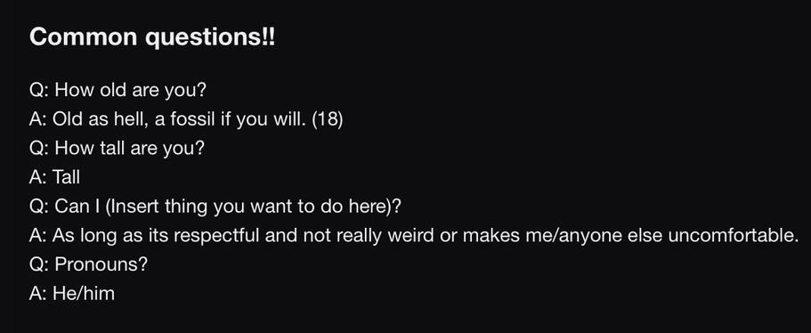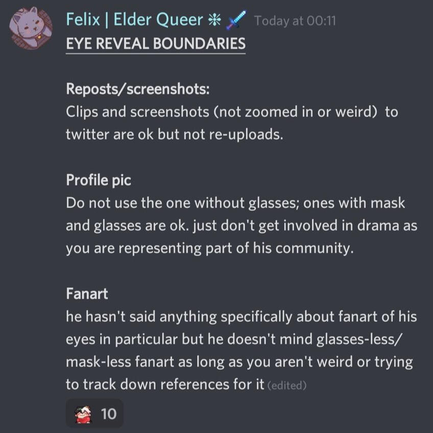 Profile Picture: he is fine with people using his pictures as a pfp but he doesn’t want to be connected with drama so that would probably include using his pfp, having him in your user, etc, while engaging in drama. He's also expressed that once he face reveals, he prefers that you don't have it as your pfp and would rather have people use the pictures with him wearing the mask and glasses!