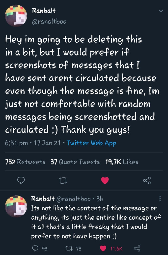 The screenshot was in response to one of his previous mods stating to not attack a different mod that met up with Ranboo. In which he responded with the tweets above