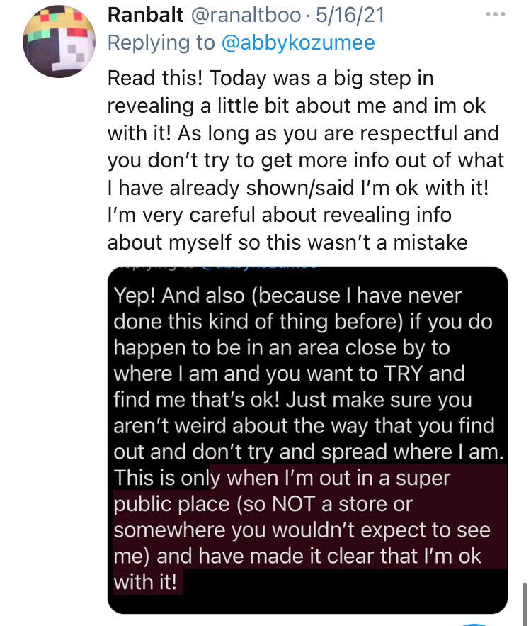 People breaking boundaries: he has stated that if you see someone say/do one of these things, don’t bring more attention to it. Everyone commenting and qrting, or screenshotting something from another platform and posting it gives it MORE attention and makes it more likely he’ll see it. He encourages people to respectfully ask someone to take it down and if they don't, just block and move on!
