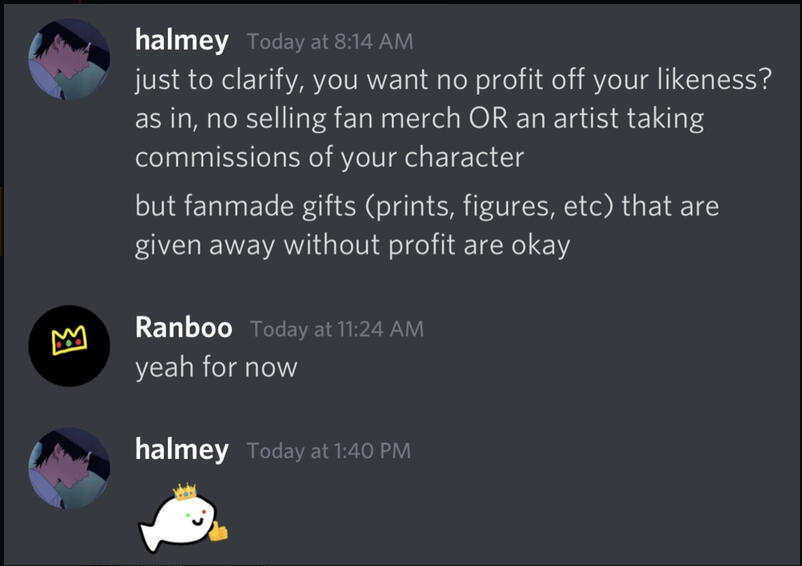 Fanmerch: Ranboo has responded to a tweet containing a picture of unofficial Ranboo merch that someone saw by encouraging people not to buy Ranboo merch from unofficial websites. This suggests that he is not okay with people selling their own fanmerch.